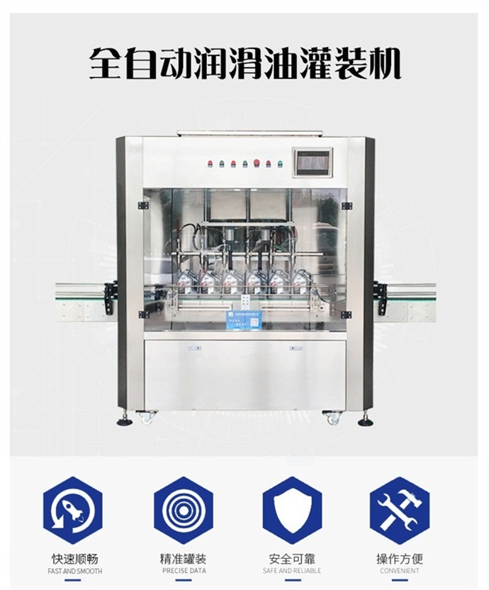 六頭柱塞式全自動潤滑油灌裝機 設備簡介: 該六頭柱塞式全自動潤滑油灌裝機獨特的灌裝頭設計及真空回吸系統,確保灌裝過程無殘油滴漏,快慢雙速灌裝,灌裝速度可調,杜絕溢瓶現象