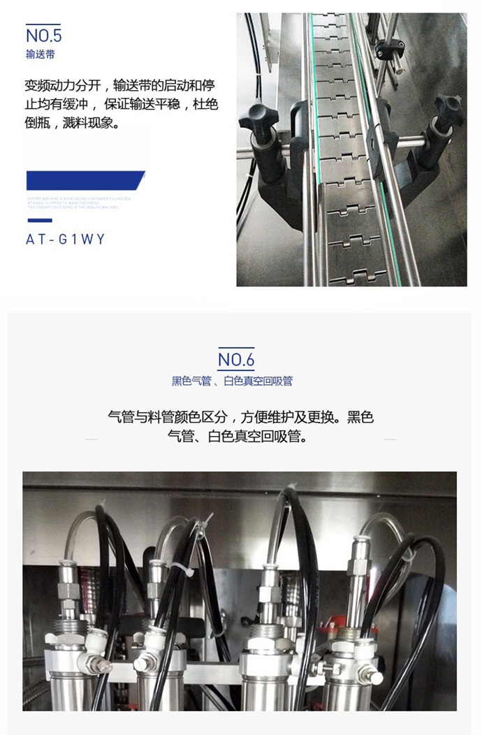 該六頭柱塞式全自動潤滑油灌裝機獨特的灌裝頭設計及真空回吸系統,確保灌裝過程無殘油滴漏,快慢雙速灌裝,灌裝速度可調,杜絕溢瓶現象。該機采用動力灌裝,無需配裝高位罐,簡化了安裝工序,提高了灌裝效率。履帶式壓蓋機,穩定無噪音,無空壓現象。觸摸屏界面友好,操作簡捷,SIEMENS PLC控制系統,運算速度快,性能穩定,品質卓越。電、氣件均采用精品元件,確保整機運作穩定。